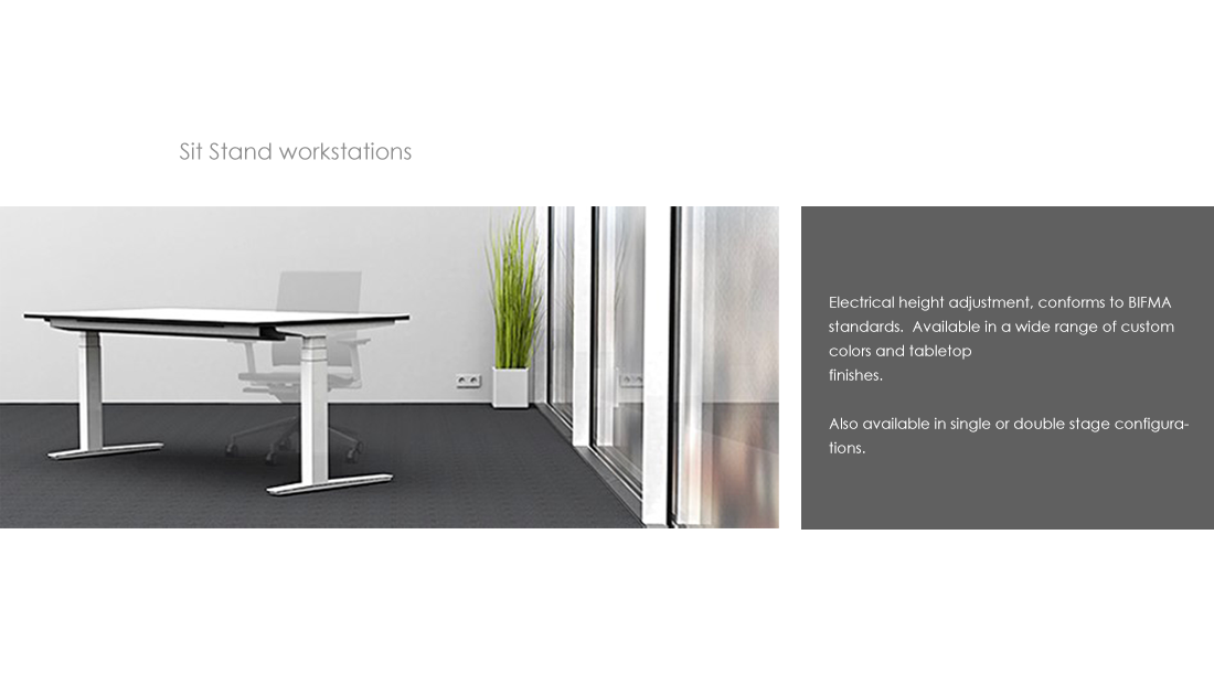 Electrical height adjustment, conforms to BIFMA standards. Available in a wide range of custom colors and tabletop finishes. Also available in single or double stage configurations.